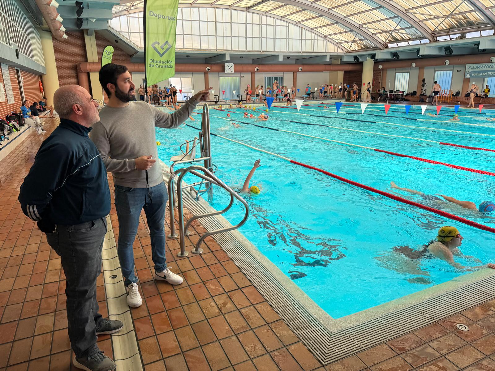 Concejal de Deportes de Almuñécar junto al personal de la pisicna muncipal en la jornada de natación de invierno de diputación